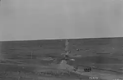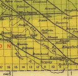 By 1911, the CNoR was reported to be constructing 300 miles of new rail lines in Saskatchewan, employing 500 teams and 2,500 men.[27] Construction for a new branch line from Luxton to Ceylon, serving Colgate and Goodwater along the way, was authorized in 1908.[28] This branch line was initially begun in 1909 from the main CNoR line at Maryfield, Saskatchewan, just west of the Manitoba border, and is sometimes referred to as the "Maryfield Extension."[28] According to train historian Adam Peltenburg, the CNoR rail line branch through Goodwater was part of, "major developments in the prairies" that began around 1910.[26] In 1911, the trade publication, Daily Consular and Trade Reports, wrote that, "one of the most important of the new lines now under construction in that province is the Maryfield extension, to be carried through the coal fields to Lethbridge, Alberta."[27] Several community accounts report that surveyors of the CNoR were responsible for renaming the town from "Juell" to "Goodwater," circa 1910–1011.[16]