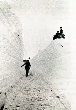 Severe winter blizzard weather and snow accumulation during the winter of 1946-47 caused over sixteen days of isolation with no train service or supplies to Goodwater, as well as many other southern Saskatchewan towns. In January, 1947, the Canadian Press reported that "five feet of hard-packed snow covered tracks and some drifts were estimated to be 28 feet high" in Goodwater.[31] On January 22, then-general store merchant, and future Goodwater Postmaster, Clair Archibald Kelly stated that the shortage of coal would be "serious" if Goodwater were forced to wait another day for supplies.[32] The only road open in southern Saskatchewan was the road between Regina and Yorkton, and no trains passed through Goodwater from January 11 until January 24.[31]