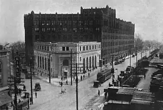 Wide corridors bisected the main floor longitudinally, separating the 12 store rooms and the auditorium and gymnasium. The auditorium was well appointed. Its main floor and suspended balcony seated 1,686. The stage was 40 feet (12 m) across, with double apertures, so as to permit its use by both the main auditorium and gymnasium. The gymnasium had a seating capacity of 5,000 people. An indirect lighting system was used throughout the auditorium with the exception of hanging candle fixtures which case a glow upon mural panels arranged on the side wall. A French Renaissance decoration scheme was used.[3] The large gymnasium with gallery had a floor space of 172 by 100 feet (52 m × 30 m), large enough to permit five basketball games simultaneously.