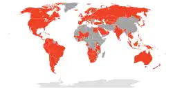 The full country list includes: Albania, Angola, Antigua and Barbuda, Argentina, Armenia, Aruba, Australia, Austria, Azerbaijan, Bahrain, Belarus, Belgium, Belize, Benin, Bolivia, Bosnia-Herzegovina, Botswana, Brazil, Burkina Faso, Cambodia, Canada, Cape Verde, Chile, Colombia, Costa Rica, Croatia, Cyprus, Czech Republic, Denmark, Dominican Republic, Ecuador, Egypt, El Salvador, Estonia, Finland, Fiji, France, Gabon, Germany, Greece, Guatemala, Haiti, Honduras, Hong Kong, Hungary, Iceland, India, Indonesia, Ireland, Italy, Ivory Coast, Jamaica, Japan, Jordan, Kazakhstan, Kyrgyzstan, Kuwait, Lao People's Democratic Republic, Latvia, Lebanon, Lithuania, Luxembourg, Macedonia, Malaysia, Mali, Malta, Mauritius, Mexico, Moldova, Namibia, Netherlands, Nepal, New Zealand, Nicaragua, Niger, Norway, Oman, Panama, Papua New Guinea, Paraguay, Peru, Philippines, Poland, Portugal, Qatar, Rwanda, Russia, Saudi Arabia, Senegal, Singapore, Slovakia, Slovenia, South Africa, South Korea, Spain, Sri Lanka, Sweden, Switzerland, Taiwan, Tajikistan, Tanzania, Thailand, Togo, Trinidad and Tobago, Turkey, Turkmenistan, Uganda, Ukraine, United Arab Emirates, the United Kingdom, the United States, Uruguay, Uzbekistan, Venezuela, Vietnam, Zambia, Zimbabwe [40]