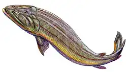 Gooloogongia (/ˌɡʊlʊˈɡɒŋɡiə/ GUU-luu-GONG-gee-ə) is a genus of prehistoric lobe-finned fish which belonged to the group of rhizodont fishes. Gooloogongia lived during the Late Devonian period (Famennian stage, about 360 million years ago).[1] Fossils have been found in the Canowindra site, (Australia).[1] It was named by Zerina Johanson and Per Ahlberg in 1998. In general size and shape Gooloogongia is similar to the modern saratoga which lives in the tropical rivers of northern Australia.