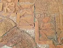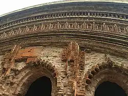 The terracotta plaques on the front arches of the temple depict the battle between the army of Rama and Ravana, which are now damaged or destroyed. At that time, the facade decorations served as visual illustrations of the popular religious texts Ramayana and Mahabharata.[4]