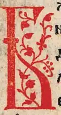 The ornamental headings are printed in red in calligraphic ligatured script with interlaced letters. Especially elaborate are two headings, introducing the Canticles and the Psalms, respectively; they have floral additions in the form of little leaves.[25] The initials used in the psalter can be divided into two groups. The more numerous group comprises 110 initials with slender strokes adorned with graceful foliate tendrils.[24] Their design is based on the decorative tradition of Cyrillic manuscripts, as well as on Renaissance floral motifs.[28] A majority of them are printed from woodcuts created for the 1519 hieratikon. The second group are 39 initials composed of densely intertwined vines. They are larger and look heavier, extending over six to seven lines of text. They are based on initials in the 1508 Wallachian hieratikon. The first part of the Goražde Psalter, comprising the Psalms, is more decorated than the rest of the book. In the first part, the two types of initials are used alternately, most of them printed in red. The rest of the book contains only the initials with slender strokes, and they are rarer, smaller, and simpler than in the Psalms; they are equally printed in black and red.[24]