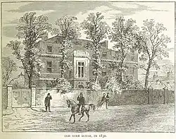 Gore House, built in the 1750s, with its 3-acre (1.2 ha) grounds was in Middlesex, England in a large exclave of St Margaret Westminster, Kensington Gore. Until its west wing soon became Grove House it was set apart from the east end of a row of 18th-century houses running from Palace Gate (near Kensington Palace) to the east, and was part of a phase of such houses facing Kensington Gardens as far as Knightsbridge, a broad bridge across the West Bourne. As the 1831 map, inset, shows: Upper Kensington Gore was the short-lived name for a short section of Kensington Road/Gore which was fronted by grand houses with large grounds and by Kensington Gardens. Its interiors were planned and supervised by leading architect Robert Adam.