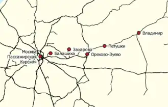 The Gorkovsky suburban railway line or Gorkovskoye line[1] (Russian: Горьковское направление Московской железной дороги) is one of eleven suburban railway lines used for suburban railway connections between Moscow, Russia, and surrounding areas, mostly in Moscow Oblast. The Gorkovsky suburban railway line connects Moscow with the station in the east, in particular, with the towns of Reutov, Balashikha, Elektrougli, Elektrostal, Noginsk, Pavlovsky Posad, Elektrogorsk, Orekhovo-Zuyevo, Pokrov, Petushki, Kosteryovo, Lakinsk, and Vladimir. The stations the line serves are located in Moscow, as well as in the towns of Reutov, Balashikha, Elektrogorsk, Elektrostal, Noginsk, Pavlovsky Posad, and Orekhovo-Zuyevo in Moscow Oblast, as well as in Petushinsky District, Sobinsky District, and the city of Vladimir of Vladimir Oblast. The suburban trains have their western terminus at Moscow Kursky railway station in Moscow. In the eastern direction, the suburban trains terminate at Balashikha, Zheleznodorozhnaya, Kupavna, Fryazevo, Zakharovo, Elektrogorsk, Petushki, and Vladimir.[2] The line is served by Moscow Railway between Moscow and Petushki and by Gorky Railway between Petushki and Vladimir. The suburban railway line follows the railway which connects Moscow with Nizhny Novgorod (formerly Gorky, hence the name) via Vladimir. It is fully electrified. Between Moscow and Vladimir, there are two tracks.[3] The distance between Moscow Kurskaya railway station and Vladimir is 190 kilometres (120 mi).