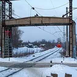 The suburban railway line was electrified in stretches. From 1931 to 1933, the stretch between Moscow and Obiralovka (currently Zheleznodorozhnaya) was electrified; in 1933, Reutovo to Balashikha, in 1957 Zheleznodorozhnaya to Fryazevo and Fryazevo to Noginsk, and in 1958 Fryazevo to Petushki.[6] The part between Petushki and Vladimir was electrified in 1959.[7]