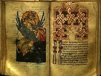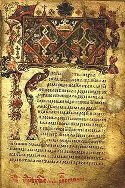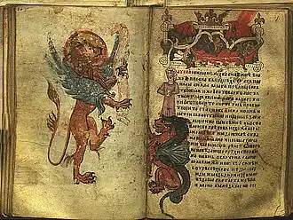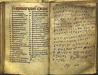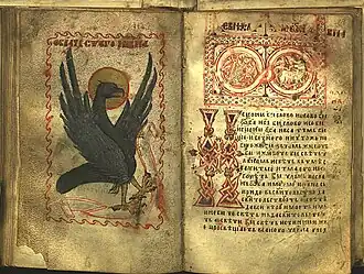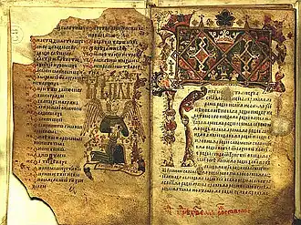 The Gospel of Saint Nicholas (Serbian: Никољско јеванђеље, romanizedNikoljsko jevanđelje) is a Serbian Script illuminated manuscript written on parchment in 13th from the Serbian Orthodox Monastery of St. Nicholas of Rošci. It is written on parchment, 16x10.5 cm in size, with 144 pages with around 27 lines of text per page.[1] It is decorated with illuminations, initials and flags, gold and silver details. The gospel was found by Vuk Stefanović Karadžić in the Monastery of St. Nicholas of Rošci, after which the manuscript has been named, and was published by Đuro Daničić in 1864. According to the philologist Pavel Šafárik (1858), the Gospel, which he called "The Gospel of Queen Jelena", was written for Helen of Anjou, between 1240 and 1250.[2]