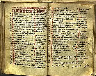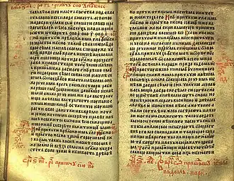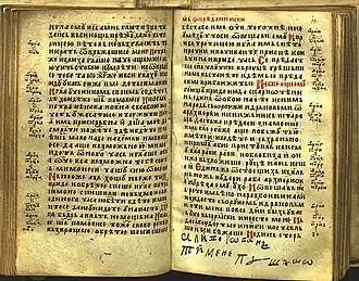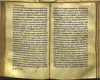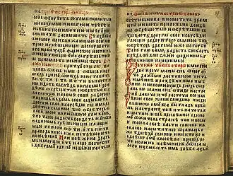 It is written in the Serbian recension of Church Slavonic (also sometimes classified into a distinct Bosnian recension),[3][4] with traces of the vernacular, such as sporadic usage of the ikavian reflex of Yat (e.g. Mat II:2 ⟨звыздоу⟩).[5][6] The Gospel of St. Nicholas was once owned by the Serbian Orthodox monastery near Ovčar Banja, and today it is located in Ireland.