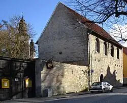 The Kapitelhusgården (the Chapter House Manor) was the residence of the bishop of Linköping on his visits to Visby during the Middle Ages, and is mentioned as such for the first time in 1432. The ground floor of the main house or Chapter House (Kapitelhuset), was built during the first half of the 13th century, with the grand hall on the second floor added about half a century later. The building has no cellar.[19] The house functioned as the town's firewood depot, well into the 19th century and was hence nicknamed "the bishop's woodshed".[20] As of 2015 the house is owned by the Gotlands Fornvänner.[21]