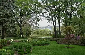 After the British conquest, the seminary, not having enough funds, sold one of the lots in 1780 to an English officer, Henry Watson Powell, who named this area Powell Place.[4][5] To create comfortable living quarters, he had a villa, greenhouses and trails built. The park again changed its name in 1811, when Michael Henry Perceval became owner and called it Spencer Wood.[4][5] However, its splendour today is owed in part to Henry Atkinson, who bought this land in 1833.[4] With his gardener, he created an English-style garden with elms, oaks and trails. Without an owner in 1854, the estate was divided into several sections and the most imposing lot was bought by the government of the Province of Canada to house the governor general.[4]