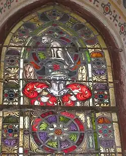 There are three historical windows in the three sections of the choir. The left-hand window, known as the Schlabrendorf window, contains the family coat of arms with a bishop's mitre above it. Several preserved painted panes have been incorporated into this window, which probably date from the second construction in 1508 and were donated by Johann von Schlabrendorf, Bishop of Havelberg. Fontane, who saw this window intact before the fire, reported seeing a bishop's mitre above the coat of arms. The middle window, the Resurrection window, probably also contains old parts from the early 16th century, testimony to the craftsmanship of the stained glass artists of the Mark Brandenburg at that time. The right window shows the coat of arms of the family of the canon of Brandenburg and landowner Wilhelm von Goertzke, who had held the church patronage of the neighbouring parish of Großbeuthen since 1597.[10]