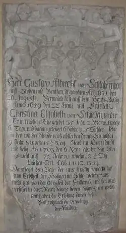 Of the ten Schlabrendorf gravestones that, according to Fontane, were walled up behind the altar and formed a "picturesque niche wall", only two slabs remain in 2004, housed in the vestibule. The epitaphs, some of which feature coats of arms and cherubs, contain inscriptions for Christina Elisabeth von Schlabrendorf († 1694, left vestibule) and Gustav Albrecht von Schlabrendorf († 1703, right vestibule, illustration below), which are still clearly legible today. The inscription on a tomb slab destroyed by fire, belonging to a member of the Schlabrendorf family who died in the First Silesian War in the Battle of Mollwitz, reads:[11]