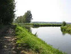 Between 1883 and 1891, the Nuthe and Nieplitz rivers were extensively cleared and straightened, and the resulting drainage deprived the fishermen in the Kietz district of their traditional livelihood. The Alte Nuthe and other old arms of the river were cut off from the watercourse and silted up or are on the verge of silting up. The expansion and straightening of the Nuthe benefited shipping, and log rafting from the densely wooded areas around Löwendorf near Trebbin developed into an important economic factor. The development of new water level regulation techniques using weirs led to the end of shipping and log rafting. The containment and widening of the Nuthe in 1933/1934 prevented summer flooding almost entirely and shaped the current appearance of the Nuthe river with its characteristic rows of trees.[3]