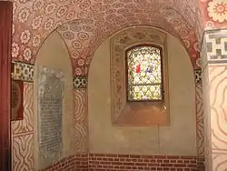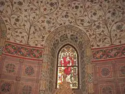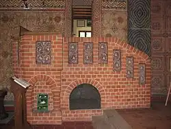 The neo-Romanesque brick pulpit on the north side of the nave dates back to the renovation in 1858/1860. A passageway leads from the pulpit to the former sacristy, which now houses a small exhibition on the history of the church and the village. With the exception of parts of the windows, the rest of the interior dates back to the reconstruction in 1909. The vibrant colours of the ornaments, the elaborate frescoes on the walls, and the rosette-like decorations in the choir and the barrel vault were also painted by Professor August Oetken. A large wheel chandelier dominates the central nave.[10]