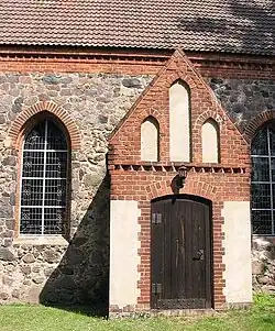 The second building, constructed in 1508, was a rectangular structure with a polygonal choir and brick edges, largely built from field stones. It had a priest's portal on the south side, and the gable of the west portal featured what was probably a wooden roof tower. The church was lower and around 7 metres shorter than the one standing today. In 1508, Bishop Johann von Schlabrendorf consecrated the church, and an altar was donated for the patron saint, St. Nicholas. Over the centuries, the Schlabrendorfs exercised what was known as "patronage", which included the rights and obligations of the founder of a church. According to an entry in the church register, the building got its first clock in 1598: "In 1633, the clockwork donated in 1598 was repaired."[9]