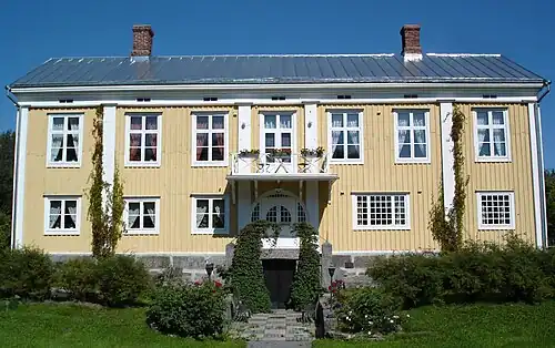 After the bankruptcy of the glassworks, in 1907, the estate was acquired by Russians.[5] In autumn 1915 the hide which had been the main area of the glassworks, including the mansion, was sold to three farmers from Jungsund.[1][3] In 1917, Erik von Troil from Vaasa bought the estate, which was then in utter decay, from the farmers.[2][4][5][6] The same year, a fire ravaged the properties, and several of the buildings around the manor house were destroyed.[2] It was owned for three generations by the family von Troil, who from the 1920s used it as their summer residence.[2][4] The manor was bought by the Hästbacka family in December 1997.[2] By the time the mansion was in bad condition.[7] The family restored the building from 1998 to 2003, giving it back its earlier splendour and largely preserving the old interior of it.[2] Also, the window glasses of the mansion produced at the glassworks in 1901 are still in place.[2] The owners now offer lodging and conference facilities on the manor.[2] The house is the only remaining building of the glassworks and it has the status of a locally highly important cultural-historical site.[2][8] The manor comprises a 15,800 m2 site on which the mansion, as well as a minor house from 1920, is situated.[2] There is also, to the west of the mansion, a large garden that was laid out already in the early times of the glassworks.[9] At the mansion observations have been made of what is said to be ghosts, including a White Lady, the identity of whom is unknown.[1][7]