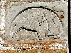 The southern façade is adorned with elements of a Romanesque frieze, made by the artist commonly referred to as Sigraf and dating from circa 1200. They depict animals, both real and mystical, as well as fighting men and knights on horseback. Scholars are divided as to what they may depict. Some speculate that they may be an illustration of evil forces, pursuing humans. Others argue that they may be illustrating an ancient tale, perhaps that of Beowulf.[1][4]