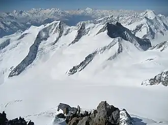 ![]() The Grünhornlücke (far right) from the Finsteraarhorn (east side) | |