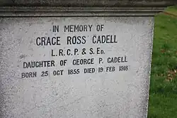 Grace Cadell qualified in 1891 after passing the examinations for the 'Triple Qualification' of LRCPE, LRCSE and LFPSG (although like many of her contemporaries she chose to abbreviate this to LRCP&SEd). This qualification had been set up jointly by the three Scottish Medical Royal Colleges to allow those not able to enter university to sit exams equivalent to those sat by university students.[1][7] This enabled her name to go on to the Medical Register and allowed her to practise as a doctor. Women did not graduate in medicine from a Scottish University until 1894.[8]