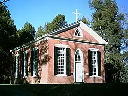 All elevations are fitted with windows; these are triple-hung with 12/12 sash, and are hung with louvered shutters and 8-inch rectilinear moldings; the moldings have been topped by ramped lintels with 6-inch-square corner blocks. Sitting over the entryway is a lancet transom with intersecting tracery, a similar design to which may also be seen in the window in the tympanum. On the east side of the church, the first bay is a jib window which according to local lore was used for funerals. The roof is surrounded by a cove cornice which serves to define two pediments, one in either facade. The roof is covered by Buckingham County, Virginia Buckingham Slate. Later additions to the exterior include a pair of small chimneys and a small wooden cross, which latter is situated at the apex of the front pediment and was erected in the 1950s.[4]