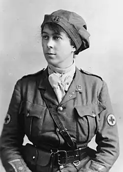 She joined the First Aid Nursing Yeomanry (FANY) because of the word "Yeomanry" in the title as she wanted to ride horses.[2] The FANY was formed to both rescue the wounded and to administer first aid from horseback.[3][4] Their founder felt that a single rider could get to a wounded soldier faster than a horse-drawn ambulance.[5][6] Each woman was trained not only in first aid but signalling and drilling in cavalry movements.[7]
