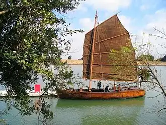 The boat's sail is made of cotton, and is treated with tanbark oak[1] which helps weatherproof the sail, and gives the sail its distinctive tan colour.[1] The sail has six wooden battens, which contribute to its distinctive appearance.