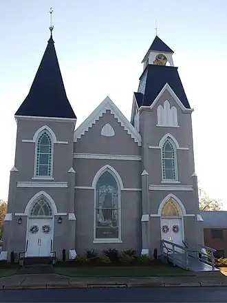 It was built in 1887–1888, and is a Gothic Revival-style church building. It has a cruciform plan, steeply pitched gable roof, corner towers of unequal height, and lancet arched doors and windows. Attached to the church in 1927–1928, is a two-story Sunday School Building with a gable roof.[2]
