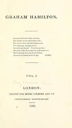 Graham Hamilton is an 1822 two volume novel by the Anglo-Irish writer Lady Caroline Lamb.[1] Her second novel to be published following her 1816 debut Glenarvon, it mocks and attacks the Whig high society in which she had been raised.[2] It was published anonymously by Henry Colburn. Her husband William (a future prime minister) assisted by proofreading the drafts.[3] Lamb was a noted figure of the Regency era who had caused a scandal with her tempestuous affair with Lord Byron. Her debut novel Glenarvon had been a thinly-disguised depiction of him.
