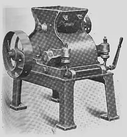 A grain flaker (also oat roller or flaking mill) is a tool for flattening whole-seed cereal grains. When this is done with oats, the seed form, called groats, becomes a foodstuff called rolled oats. Whole grains store longer but cereals are usually cooked before consumption by humans; the rolling process significantly decreases cooking time.[1] Spelt and wheat can also be rolled.[2] Grains other than oats may need to be softened before they can be rolled.[3] Oat rollers work by flattening the grain against a rolling cylinder.[1] It is possible to build a home-scale manually cranked flaking mill.[4] Oats can also be flaked using a rolling pin or a pasta press.[5]