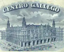 Since its inception in 1838, Teatro Tacón[a] had occupied the north-western part of the site bounded by Paseo del Prado and Calle Consulado and Calles San Rafael and San José. Its auditorium hosted such European artists as Enrico Caruso and Sarah Bernhardt. During the first years of Cuban independence when thousands of immigrants arrived in Cuba from Spain, a new building addition was constructed around the concert hall of Teatro Tacón.[2] Originally known as the Centro Gallego de La Habana, the building is decorated with sculptures by Giuseppe Moretti representing benevolence, education, music and theatre.