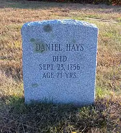 In 1707, Daniel Hayes (born c. 1685 – died 1756), then aged twenty-two, was captured and kidnapped by a hostile indigenous tribe and carried off to Canada. The capture was witnessed, and a rescue party raised, but the group did not catch up with the captors. He was tied up each night, and bound to saplings. It took thirty days to reach Canada, at which point Hayes was forced to run the gauntlet. Near the end of the gauntlet, he hid in a wigwam to avoid an attempted blow by a club. The woman in the wigwam declared that the house was sacred, and having lost a husband and son to a war, adopted Hayes as her son. He remained for several years, attending to the woman. Eventually, he was sold to a Frenchman, who learned that Hayes had skill as a weaver, so put him to work in that business. Hayes managed to earn enough to buy his freedom after two years. He then returned to Simsbury, settled down on a farm and married. He became prominent, both in civil affairs as well as the church at Salmon Brook (now Granby).[3]