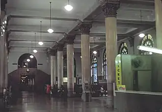 The interior of Grand Central Station was decorated as extravagantly as the exterior. The waiting room, for example, had marble floors, Corinthian-style columns, stained-glass windows and a marble fireplace, and a restaurant. The station also had a 100-room hotel, but accommodations ended late in 1901.[4][5]