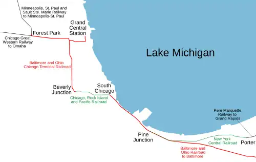 In addition to intercity passenger rail service, Grand Central Station hosted several short-lived interurban passenger rail operations. To coincide with the World's Columbian Exposition in 1893, the Baltimore and Ohio operated a special passenger train between Grand Central Station and Jackson Park, with intermediate stops at Halsted Street, Blue Island Avenue, Ashland Avenue and Ogden Avenue.[15] Grand Central Station also served as a terminal for at least three suburban commuter lines. One, operated by the Wisconsin Central, operated trains west of Grand Central Station to Altenheim.[16] The second began service in 1900 by the Chicago Terminal Transfer Railroad, and continued when B&O purchased the line in 1910. It operated six trains a day between Grand Central and Chicago Heights, stopping in Blue Island, Harvey, Thornton and Glenwood. The line was unsuccessful and ended as early as 1915.[17] The third was run by the Chicago Great Western. It ran through Forest Park to Elmhurst, Lombard, Glen Ellyn, Gretna (Carol Stream), Ingalton (West Chicago), St. Charles, Wasco, Lily Lake, Virgil, Sycamore, and DeKalb. It was also short lived. Service was discontinued in 1906. None of the other tenant railroads operated commuter trains from Grand Central Station.