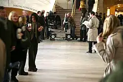 Many film and television productions have included scenes shot in the terminal. The MTA hosts about 25 large-scale and hundreds of smaller or amateur productions every year.[3] Kyle McCarthy, who handles production at Grand Central, said, "Grand Central is one of the quintessential New York places. Whether filmmakers need an establishing shot of arriving in New York or transportation scenes, the restored landmark building is visually appealing and authentic."[4] Especially during World War II, Grand Central has been a backdrop for romantic reunions between couples. After the terminal declined in the 1950s, it was more frequently used as a dark, dangerous place, even a metaphor for chaos and disorientation,[2] featuring chase scenes, shootouts, homeless people, and the mentally ill. In the 1990 film The Freshman, for example, Matthew Broderick's character stumbles over an unconscious man and watches fearfully as petty crimes take place around him.[5]