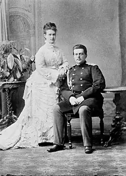 While traveling through Germany with his family in June 1871, Grand Duke Vladimir met Duchess Marie of Mecklenburg-Schwerin (14 May 1854 – 6 September 1920), daughter of Friedrich Franz II, Grand Duke of Mecklenburg-Schwerin and of Augusta of Reuss-Köstritz.[9] She was seventeen years old and was already engaged to a distant relative, Prince George of Schwarzburg.[9] Grand Duke Vladimir was then twenty four.[9] The two were smitten with each other. Vladimir was a second-cousin of Maria's father Friedrich Franz II, Grand Duke of Mecklenburg-Schwerin, a grandson of Grand Duchess Elena Pavlovna of Russia (1784-1803). They were also second-cousins in descent from Frederick William III of Prussia (1770-1840). In order to marry Vladimir, Maria broke off her previous engagement, but she refused to undergo the expected conversion to the Orthodox religion.[10] This delayed the couple's engagement for almost two years. Finally, Emperor Alexander II consented to Marie's continued adherence to her Lutheran faith, allowing Vladimir to marry her without loss of his rights to the Russian throne. The engagement was announced in April 1874.[10]