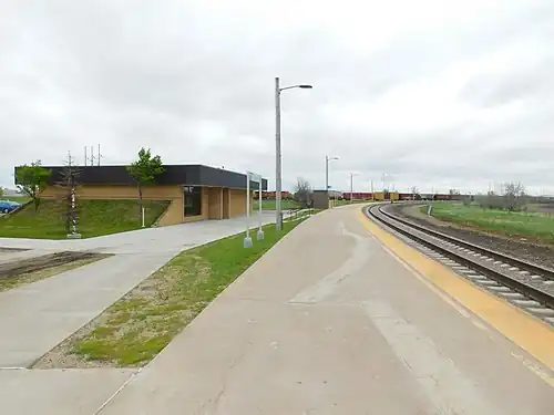 It is located at a railroad wye where Amtrak trains headed for Chicago turn south. The station was built in a standard design by Amtrak in 1982, replacing the use of a Great Northern station downtown and allowing Amtrak to serve the city without having to go downtown and then back up. For a while before the station officially opened, trains stopped here and passengers were bussed to and from the old station.[2] The former Great Northern freight station has been listed on the National Register of Historic Places since 1990.