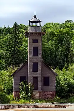 The Grand Island East Channel Light is a lighthouse located just north of Munising, Michigan and was intended to lead boats from Lake Superior through the channel east of Grand Island into the Munising Harbor. Constructed of wood, the light first opened for service in 1868. The light was very hard to see from Lake Superior, and light maintenance was very difficult so the Munising Range Lights were constructed (Munising Rear Range Light, Munising Front Range Light) and this light was removed from service in 1908[2] or 1913[5][6] (sources vary).