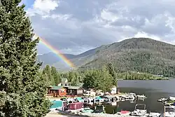 Grand Lake is Colorado's largest and deepest natural lake.[5] It is located in the headwaters of the Colorado River in Grand County, Colorado. On its north shore is located the historic and eponymous town of Grand Lake. The lake was formed during the Pinedale glaciation, which occurred from 30000 BC to 10000 BC.[6] The glacial terminal moraine created a natural dam. Natural tributaries to the lake are the North Inlet and East Inlet, both of which flow out of Rocky Mountain National Park, which surrounds the lake on three sides. Grand Lake is located 1 mile from the Park's western entrance. Grand Lake was named Spirit Lake by the Ute Tribe because they believed the lake's cold waters to be the dwelling place of departed souls.