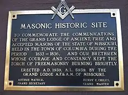 The Grand Lodge of Missouri is one of two statewide organizations, along with a Prince Hall Affiliated grand lodge, that oversee Masonic lodges in the state of Missouri. It was established on April 21, 1821. It is located in Columbia, Missouri.