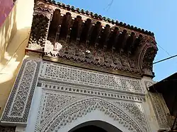 The exterior of the mosque is largely obscured by the surrounding buildings and the dense urban fabric of the old city. The mosque has 11 gates,[4] and one of the main entrances to the west, called Bab al-Kutub (Gate of the Books),[5]: 210 is framed by rich stucco decoration and a canopy of sculpted and painted wood.[2] From above, the mosque is distinguished by its rows of sloped green-tiled roofs, as well as by its large and prominent minaret. The current minaret dates from the reign of the Alaouite sultan Moulay Mohammed ben Abdallah (ruled 1757–1790).[2] Like other Moroccan minarets it has a long square shaft which is crowned by stylized merlons and topped by a much smaller and shorter tower, which in turn is topped by an iron finial holding up four golden copper balls.[2] The four facades of the minaret are covered in a surface of gleaming green faience tiles, which are a distinctive trait of minarets in Meknes.[3] Near the base of the minaret, overlooking the courtyard of the mosque, is a dar al-muwaqqit or traditional chamber for the timekeeper of the mosque.[5]: 277