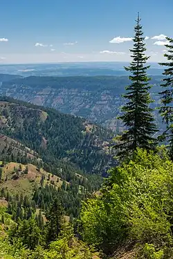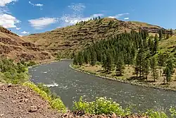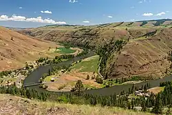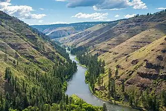 Below Elgin, the Grande Ronde enters a series of deep, winding canyons for the remaining 95 miles (153 km) of its course to the Snake River. It receives Lookingglass Creek from the left then crosses into Wallowa County at Rondowa, where it is joined from the right by its largest tributary, the Wallowa River.[13] Entering the Umatilla National Forest, it turns east, receiving Bear and Elbow Creeks from the left and Wildcat, Mud and Courtney Creeks from the right, then the Wenaha River from the left at the settlement of Troy.[14][15] From Troy, the terrain around the river becomes more open, with forests giving way to grassy ridges and rangeland.[16] The 27-mile (43 km) stretch between the Wallowa River confluence and Wildcat Creek is inaccessible by road.[6]