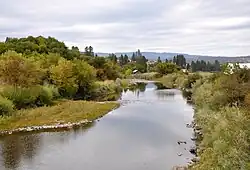 The Grande Ronde Valley, measuring about 35 miles (56 km) from north to south and up to 15 miles (24 km) from east to west, consists mostly of irrigated farmland and also includes the communities of Union, Cove, Imbler and Summerville.[6] The river once flowed in a large U-shaped bend through the east side of the valley, but is now artificially diverted to the north via the State Ditch, bypassing the long meandering section to the east.[10]: 52 At the end of the ditch the original channel – which now carries water from Catherine Creek– rejoins from the right.[9][10]: 52 At the northern end of the valley, the Grande Ronde flows through Rhinehart Gap into the smaller Indian Valley and the city of Elgin, where it receives Clark Creek from the right and Phillips Creek from the left.[11][12]