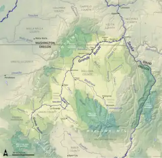 The Grande Ronde River (/ɡrænd rɑːnd/ or, less commonly, /ɡrænd raʊnd/) is a 210-mile (340 km) long[3] tributary of the Snake River, flowing through northeast Oregon and southeast Washington in the United States. Its watershed is situated in the eastern Columbia Plateau, bounded by the Blue Mountains and Wallowa Mountains to the west of Hells Canyon. The river flows generally northeast from its forested headwaters west of La Grande, Oregon, through the agricultural Grande Ronde Valley in its middle course, and through rugged canyons cut from ancient basalt lava flows in its lower course. While it joins the Snake River upstream of Asotin, Washington, more than 90 percent of the river's watershed is in Oregon.