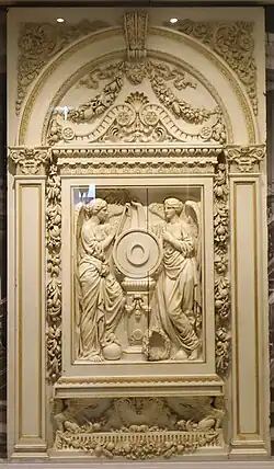 The ornamented oak panel comprised a half-point arch supported by two pilasters in composite order, each capital decorated with a winged putti's head in its centre. As a curiosity, the four volutes, two for each capital, were carved reversed. In the central panel, the round case of the clock itself rested upon an estipite adorned with laurel festoons, this was flanked by two winged female figures in mid-relief dressed with a chiton. From the onlooker's point of view, the figure at left represented Honour whereas the one at right depicted Glory. As accompanying attributes, Honour held a tablet in her left hand while the other was writing using a stylus, her left foot rested on top of a terrestrial globe. The personification of Glory had a palm branch in her right hand and next to her right foot was seen a laurel wreath in a vertical position leant against the aforesaid estipite. Surrounding the figural central panel there were different decorative motifs such as swags of fruits and flowers, egg-and-dart, scrolls, acanthus, rosettes, a pair of seated griffins, etc.