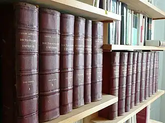 The Grand dictionnaire universel du XIXe siècle (French pronunciation: [ɡʁɑ̃ diksjɔnɛːʁ ynivɛʁsɛl dy diznœvjɛm sjɛkl], Great Universal Dictionary of the 19th Century), often called the Grand Larousse du dix-neuvième (French pronunciation: [ɡʁɑ̃ laʁus dy diznœvjɛm]), is a French encyclopedic dictionary. It was planned, directed, published, and to a substantial degree written by Pierre Larousse, though he also relied on anonymous fellow contributors and though he died in 1875, before its completion. The publication of the Grand dictionnaire universel in 15 volumes of 1500 pages extended from 1866 to 1876. Two supplements were published in 1877 and 1890.