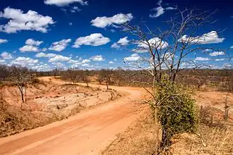 The Brazilian Northeast is an area where political and social development has been hindered by the harsh environment of the arid sertão. Characterized by the presence of nine major rivers, among which are the São Francisco and the Parnaíba, the sertão has an average annual temperature of between 20 °C and 28 °C and a maximum of 40 °C.[11] The pluviosity of the area is a source of concern for farmers and local governments alike. Although the annual average precipitation is slightly lower than 1,000 mm,[11] the rainy period, which usually lasts just two months a year, is unstable. Sometimes precipitation halts for one year or more, often causing regional droughts. Sustained occurrences of below average water availability can happen in all areas of the country as a consequence of abnormally low precipitation rates and high evaporation rates; but it is in the Northeast where they happen with greater frequency.[12] The zona da mata, which runs along the Northeastern coast and in which major cities are located. In this sub-biome, rains are frequent and vegetation is plentiful. This area does not usually suffer from droughts, but the magnitude of the Great Drought was so great that even the coastal region was impacted. Since the rivers that flow to the coast almost always have their origin in the sertão, a drought in the semiarid and arid sub-regions can extend to the entire Northeastern area.[13] Prior to Portuguese settlement in the 16th century, there were no pressing problems because the predominant caatinga ecosystem was adapted to the cyclical climate. Indigenous groups who inhabited the land were affected by extreme droughts, which forced them to move to the humid coastal region, but these rarely occurred.