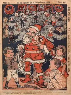 The Santa Claus tradition did not exist in Brazil in the 19th century. His popularity started to grow in the early 20th century, with an early representation of him, already in red and white garments, appearing in the 24 December 1904 edition of the Brazilian magazine O Malho. By 1908, Santa Claus had become synonymous with gift-giving, and in the 1930s he was firmly established among Brazilians. After World War I, Brazil witnessed the emergence of various nationalist cultural movements with diverse trends, particularly with the Modern Art Week festival in 1922. It is in this context that, at the end of the year 1932, around Christmas time, a nationalist initiative arose to overthrow Santa Claus, introducing in his place an indigenous creation, Grandpa Indian. This campaign, led by writer Christovam de Camargo, began in the newspaper O Globo.[1] On 28 November, this newspaper published a manifesto in defense of Grandpa Indian.[4][† 2]