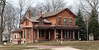 The Granger House, also known as the Granger House Victorian Museum, is a historic heritage tourism site located in Marion, Iowa, United States. This Victorian Italianate house was built around 1860 by Charles Myers. Earl Granger bought the house in 1876 and it remained in his family until 1973.[2] Granger built the carriage house in 1879, and built an addition onto the main house the following year, reflecting his growing wealth in livestock production and local banking investments. The two-story brick building features a 1+1⁄2-story ell, a gable roof, bracketed eaves, and arched stone lintels over the symmetrically arranged windows. The front porch is not the original. The house was listed on the National Register of Historic Places in 1976.[1]