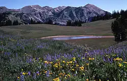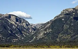 Granite Canyon is located in Grand Teton National Park, in the U. S. state of Wyoming.[2] The canyon was formed by glaciers which retreated at the end of the last glacial maximum approximately 15,000 years ago, leaving behind a U-shaped valley.[3] The canyon lies between Rendezvous Mountain to the south and Mount Hunt to the north. The trailhead for the canyon is on the Moose–Wilson Road about 2 miles (3.2 km) north of Teton Village. One of the most popular hikes from the trailhead is to Marion Lake by way of the Granite Canyon Trail which traverses the length of the canyon. Another popular hike involves riding the aerial tram located at the Jackson Hole Mountain Resort in Teton Village to the top of Rendezvous Mountain, and then descending back to Teton Village by way of Granite Canyon. The descent from the summit of Rendezvous Peak back to Teton Village is an often steep one with an altitude loss of 4,100 feet (1,200 m).[4] The historic Upper Granite Canyon Patrol Cabin is situated near the entrance to the canyon and was listed on the National Register of Historic Places in 1998.[5]
