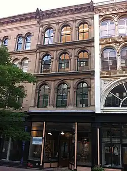 On 9 September 1859, 60 buildings in downtown Halifax, including all wooden shops in the north of Granville Street, were destroyed by a fire.[3][4] This event led to the reconstruction of the mall by the Toronto architectural firm of William Thomas & Sons. The firm designed a unified streetscape with cast iron store fronts, Italianate detailing, and forms that would soon dominate prime Halifax building. The buildings were constructed using stone and brick, which became the standard materials for new construction in the city.[2][5][6]